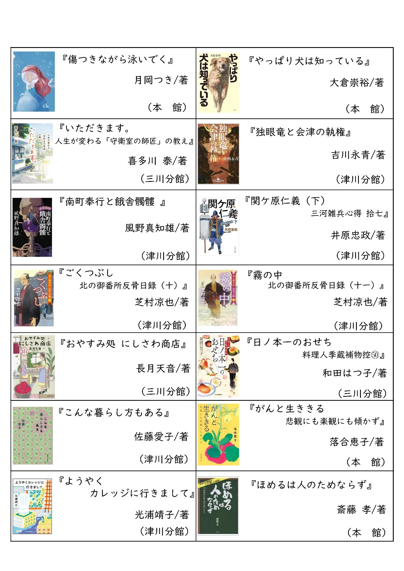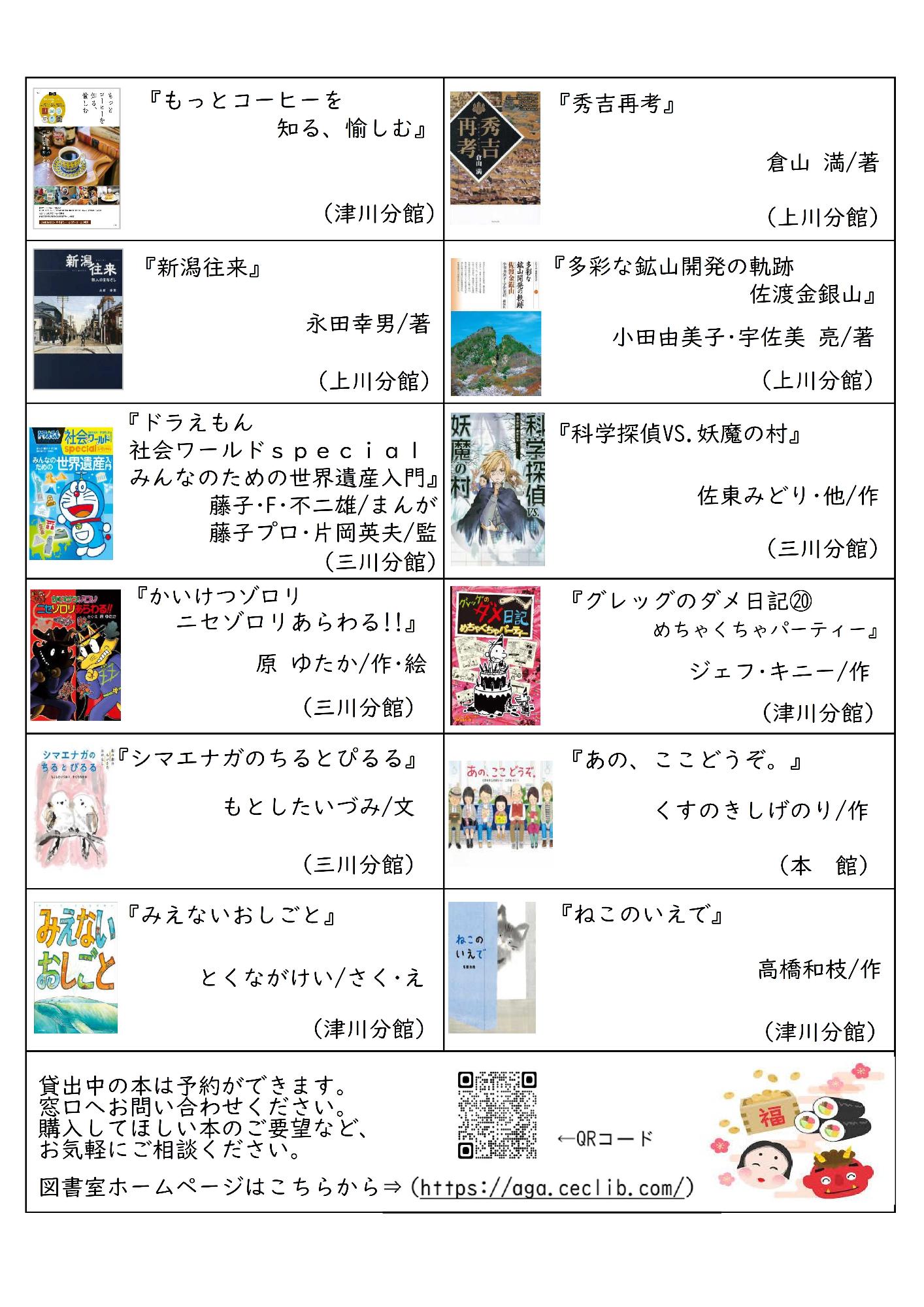 阿賀町公民館図書室新着図書のお知らせ Post 更新日:2026年02月16日 阿賀町公民館図書室から2月の新着図書のお知らせです。ぜひご利用ください。 社会教育課〒959-4392新潟県東蒲原郡阿賀町鹿瀬8985番地1電話:0254-92-3333 ファックス番号:0254-92-0083お問い合わせはこちら