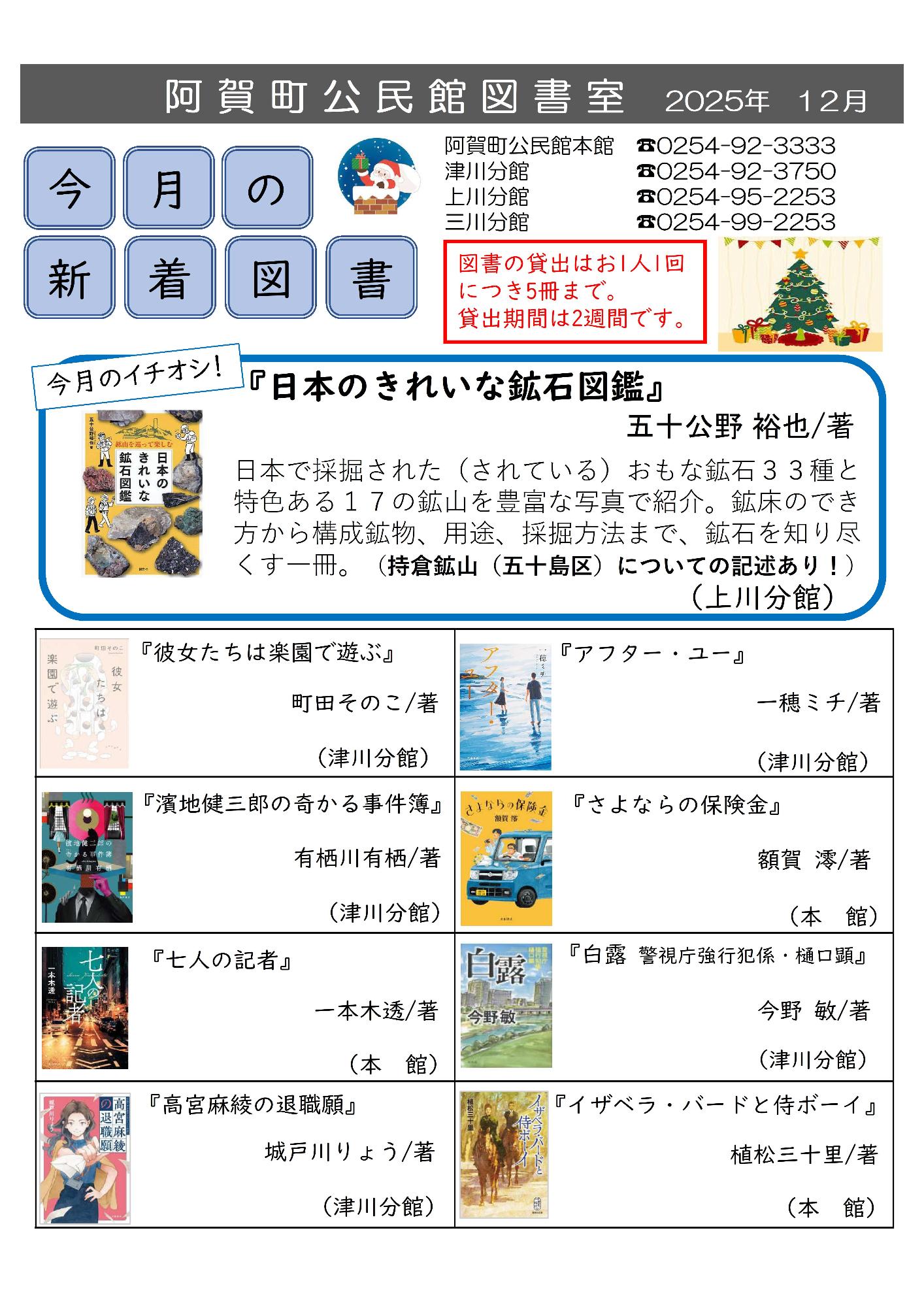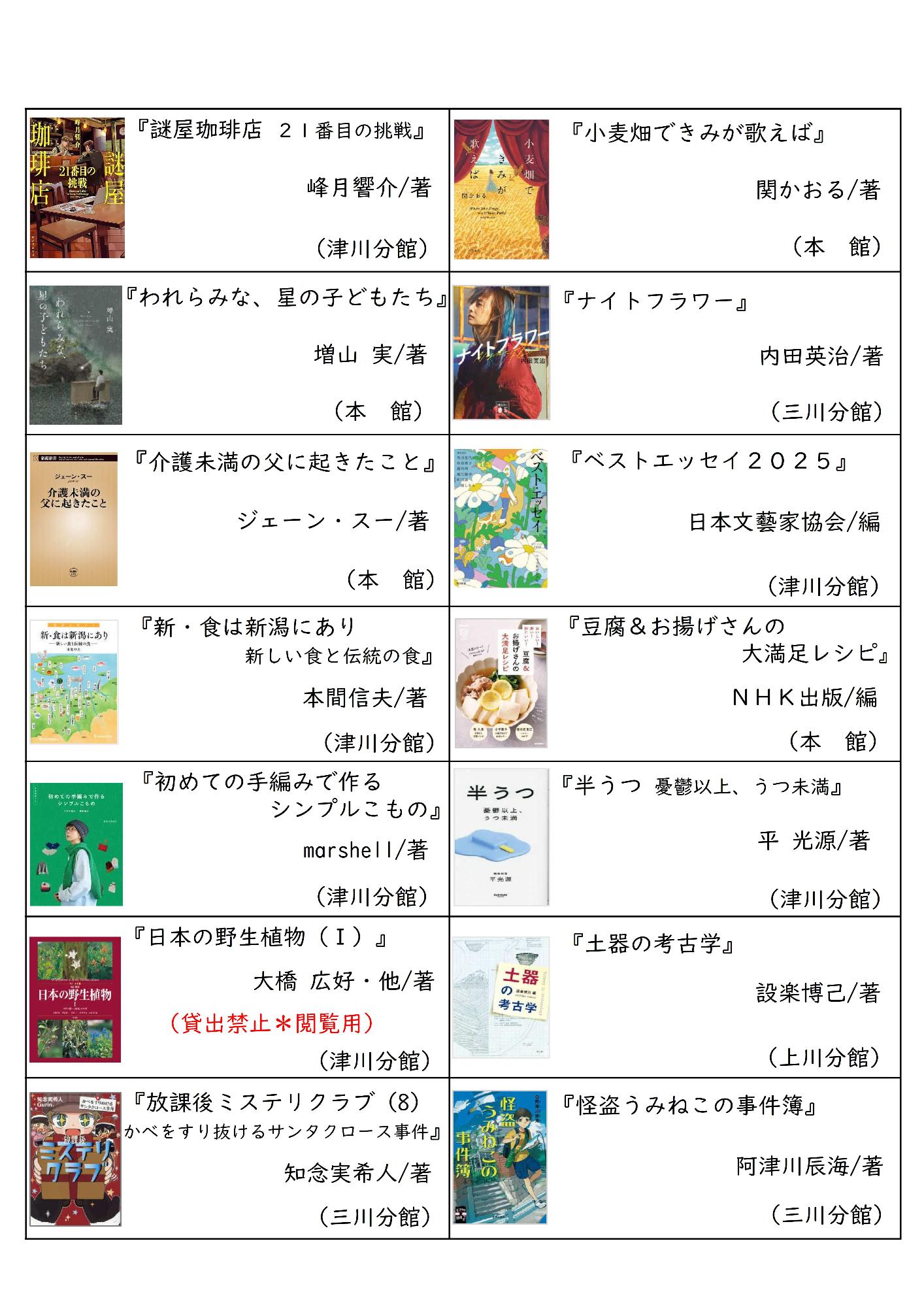 阿賀町公民館図書室新着図書のお知らせ Post 更新日:2025年12月15日 阿賀町公民館図書室から12月の新着図書のお知らせです。ぜひご利用ください。 社会教育課〒959-4392新潟県東蒲原郡阿賀町鹿瀬8985番地1電話:0254-92-3333 ファックス番号:0254-92-0083お問い合わせはこちら