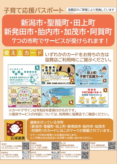阿賀町子育て応援パスポートを、新潟市・聖籠町・田上町・新発田市・胎内市・加茂市の協賛店で提示すると、各市町の住民と同じサービスを受けることができます。