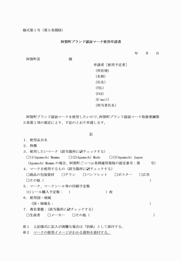 (2) 「Agamachi Made」 前号に規定するものを除き、阿賀町で生産又は採取されたもの(本号において「町産品」という。)及びは町産品を製造又は加工したもので、阿賀町の地域振興に寄与すると認められるもの