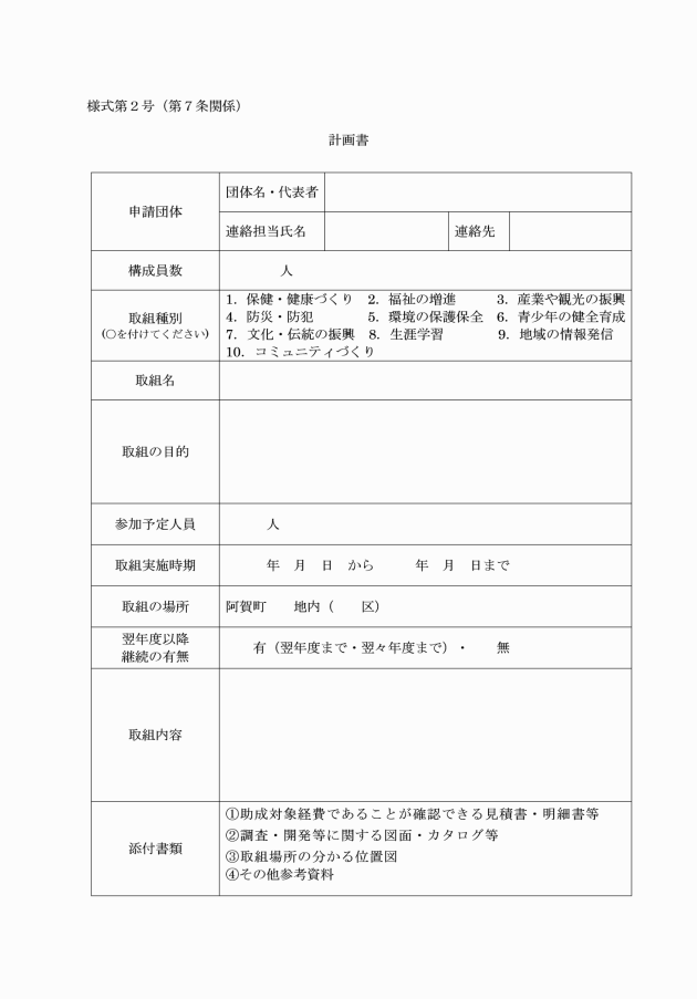 第7条 助成金の交付を受けようとする団体(以下「申請団体」という。)は、あらかじめ次に掲げる書類を添えて、町長に提出しなければならない。